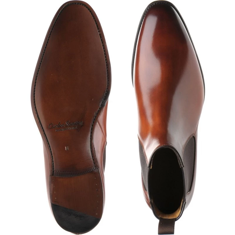 7902 is a very elegant plain fronted Chelsea boot on a Goodyear welted leather sole. Carlos Santos make some fabulous shoes for our Herring range to our designs. The shoes in the Patina collection are all part of the standard Carlos Santos own brand range. As the factory create these shoes with very fine hand crafting skills, including hand patination, you can order this style in many colours. We have chosen to stock a couple of colours but, if you are prepared to wait at least six weeks, we can supply any of the colours shown. If you do order a bespoke colour we reserve the right to charge a re-stocking fee of 40 GBP on unusual colours or sizes, if you cancel or return your order. These shoes are hand-patinated individually in the Carlos Santos factory so there can be a noticeable variation of colour from the shoes you receive to the picture on the website. We always strive to get consistency but in a hand-finished product this is not always possible and is a sign of quality. Please note that we would only advise using a gentle wax-based cream or polish to protect carefully hand-finished shoes such as these. Harsh products such as renovating creams, high solvent based products and rain protectors may strip the carefully applied finish. If this happens we will not be able to refund the shoes although we may be able to get them re-finished at the factory for you at your cost. |