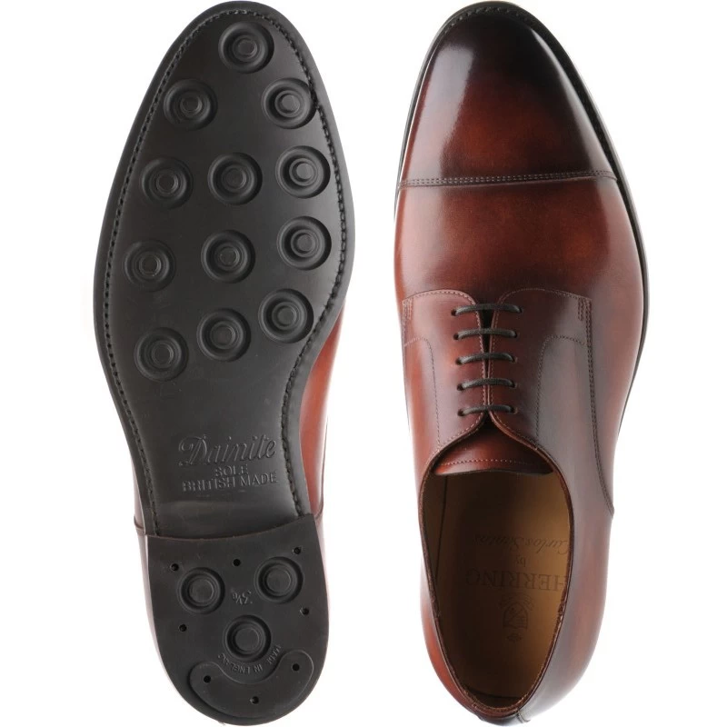 9381 is a toe-cap Derby or Gibson style shoe on a Goodyear welted Dainite rubber sole. Carlos Santos make some fabulous shoes for our Herring range to our designs. The shoes in the Patina collection are all part of the standard Carlos Santos own brand range. As the factory create these shoes with very fine hand crafting skills, including hand patination, you can order this style in many colours. We have chosen to stock a couple of colours but, if you are prepared to wait at least six weeks, we can supply any of the colours shown. If you do order a bespoke colour we reserve the right to charge a re-stocking fee of 40 GBP on unusual colours or sizes, if you cancel or return your order. These shoes are hand-patinated individually in the Carlos Santos factory so there can be a noticeable variation of colour from the shoes you receive to the picture on the website. We always strive to get consistency but in a hand-finished product this is not always possible and is a sign of quality. Please note that we would only advise using a gentle wax-based cream or polish to protect carefully hand-finished shoes such as these. Harsh products such as renovating creams, high solvent based products and rain protectors may strip the carefully applied finish. If this happens we will not be able to refund the shoes although we may be able to get them re-finished at the factory for you at your cost. |