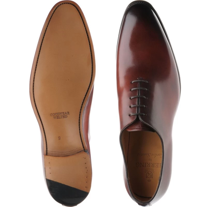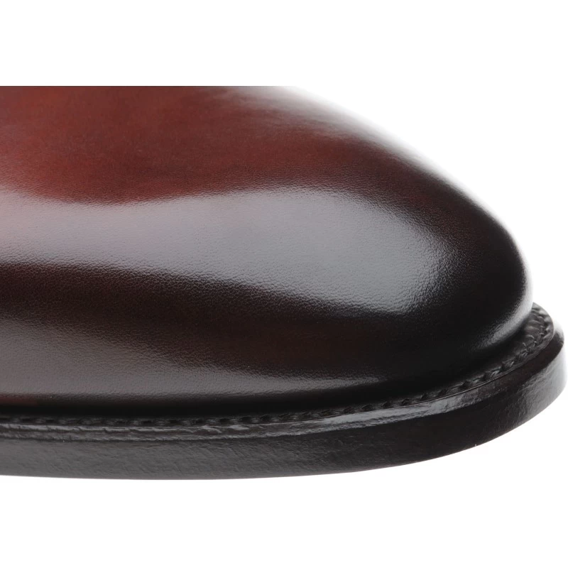 Herring Chaucer is a stunning wholecut shoe, made from fine leathers on a Goodyear welted leather sole. The wholecut is one of the hardest shoes to make. It requires one flawless piece of leather and a craftsman who can meticulously shape that one piece over the last, stitch it to the sole and finish it without a single mistake. Every gentleman should own at least one wholecut just to admire the handcraft that goes into it. These shoes are hand-patinated individually in the Carlos Santos factory so there can be a noticeable variation of colour from the shoes you receive to the picture on the website. We always strive to get consistency but in a hand-finished product this is not always possible and is a sign of quality. Please note that we would only advise using a gentle wax-based cream or polish to protect carefully hand-finished shoes such as these. Harsh products such as renovating creams, high solvent based products and rain protectors may strip the carefully applied finish. If this happens we will not be able to refund the shoes although we may be able to get them re-finished at the factory for you at your cost. The Z160 last is a very elegant shape with a chiselled toe box giving a bespoke appearance. This is a standard fitting shoe so you can confidently order your normal UK size. Bear in mind that the toe is elongated so it may seem very roomy at the front but this does not make it too big. It should fit across your foot and your heel should not slip if it is the correct size. |